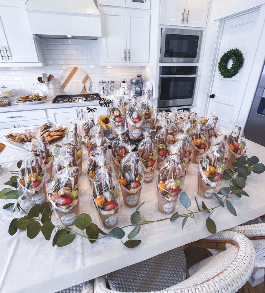 Each charcuterie cup includes 2-3 cheeses, fresh and dried fruit,